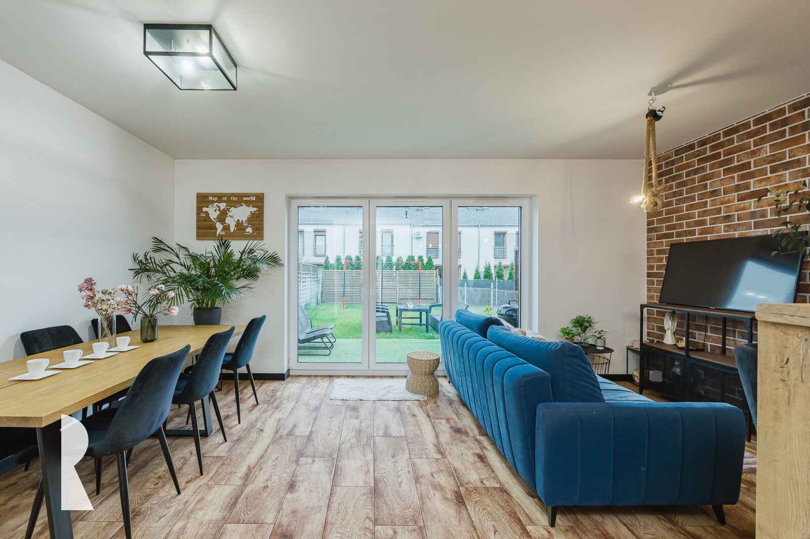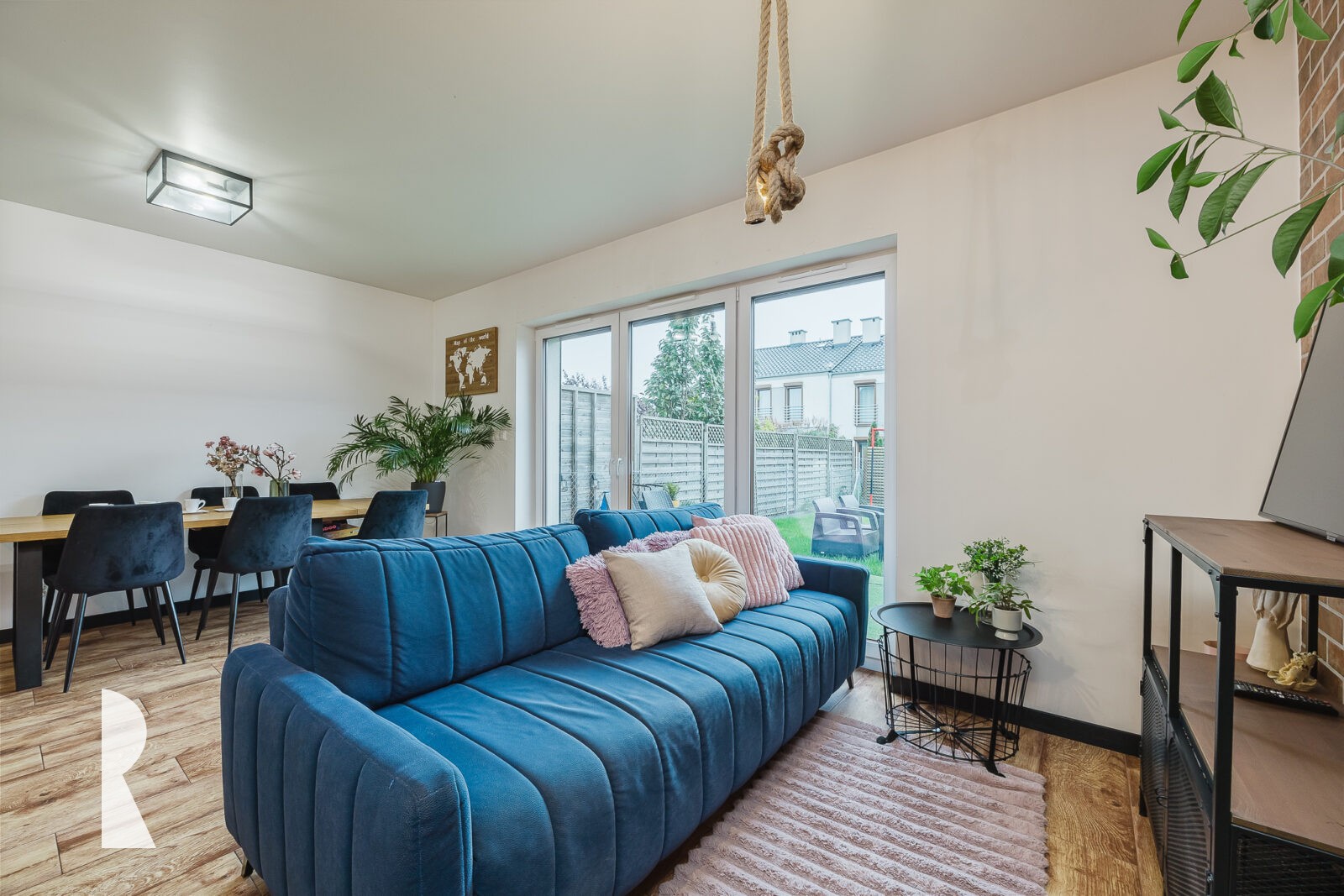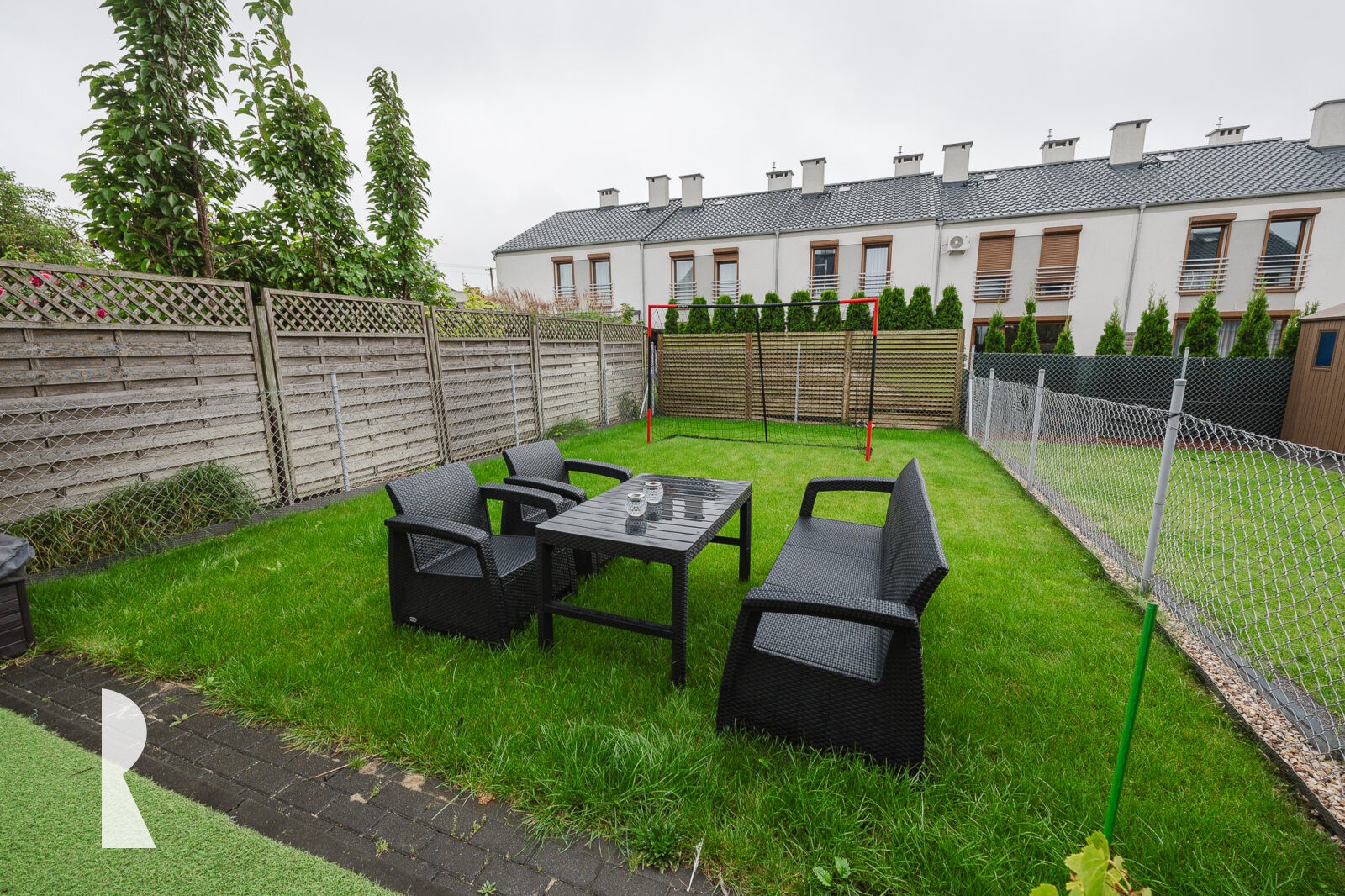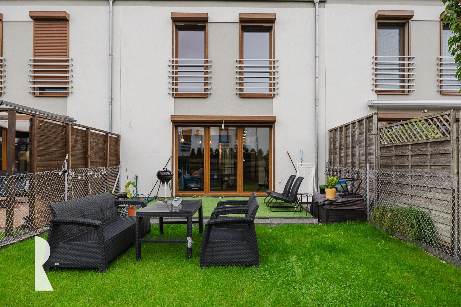 Od tyłu domu strefa wypoczynkowa zapewnia oddzielenie od dźwięków ulicy, teren pokryty jest zadbanym trawnikiem ze stołem, krzesłami i fotelami. To miejsce jest pełne słońca.