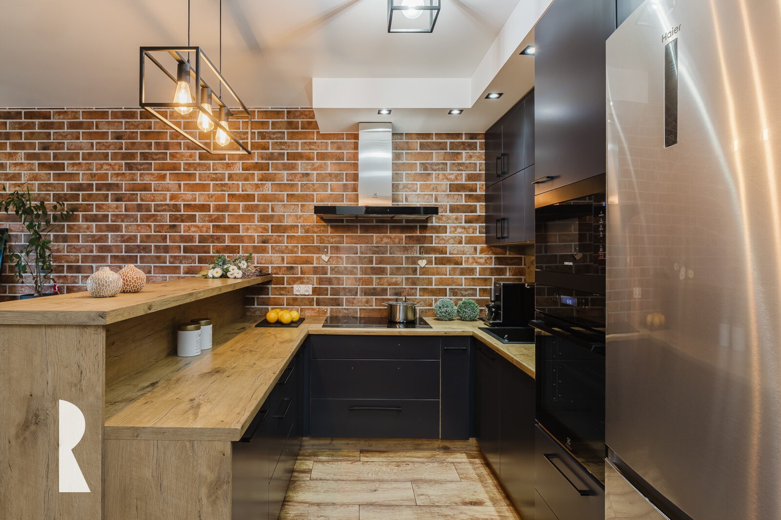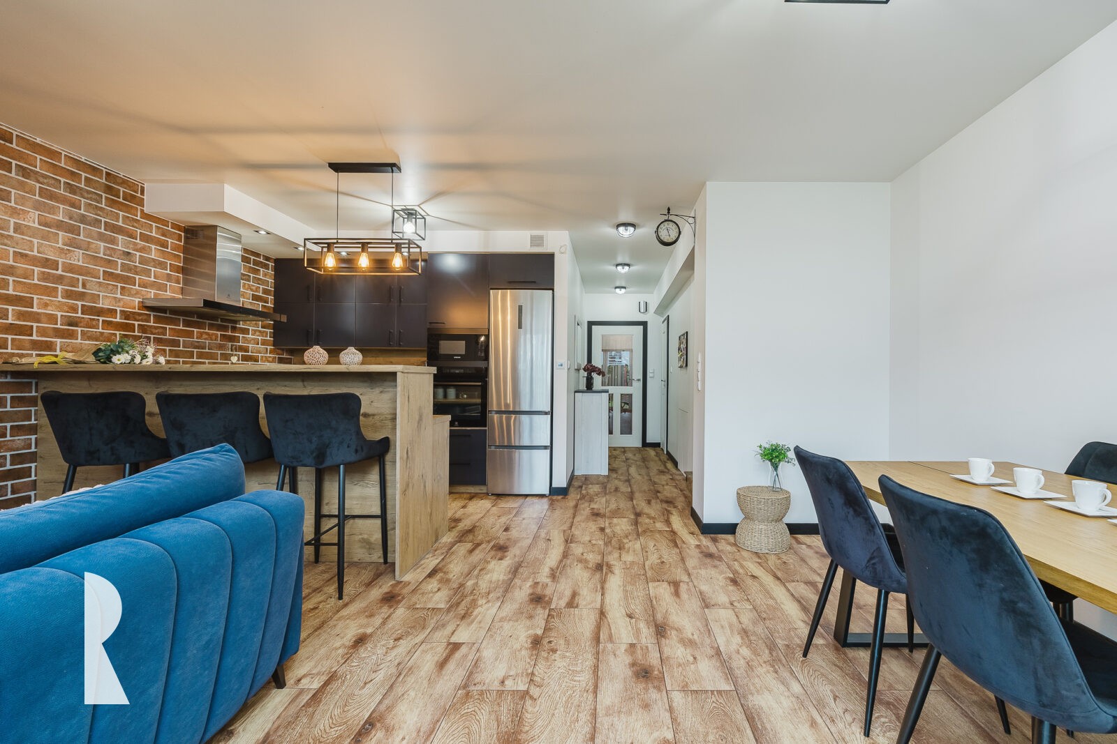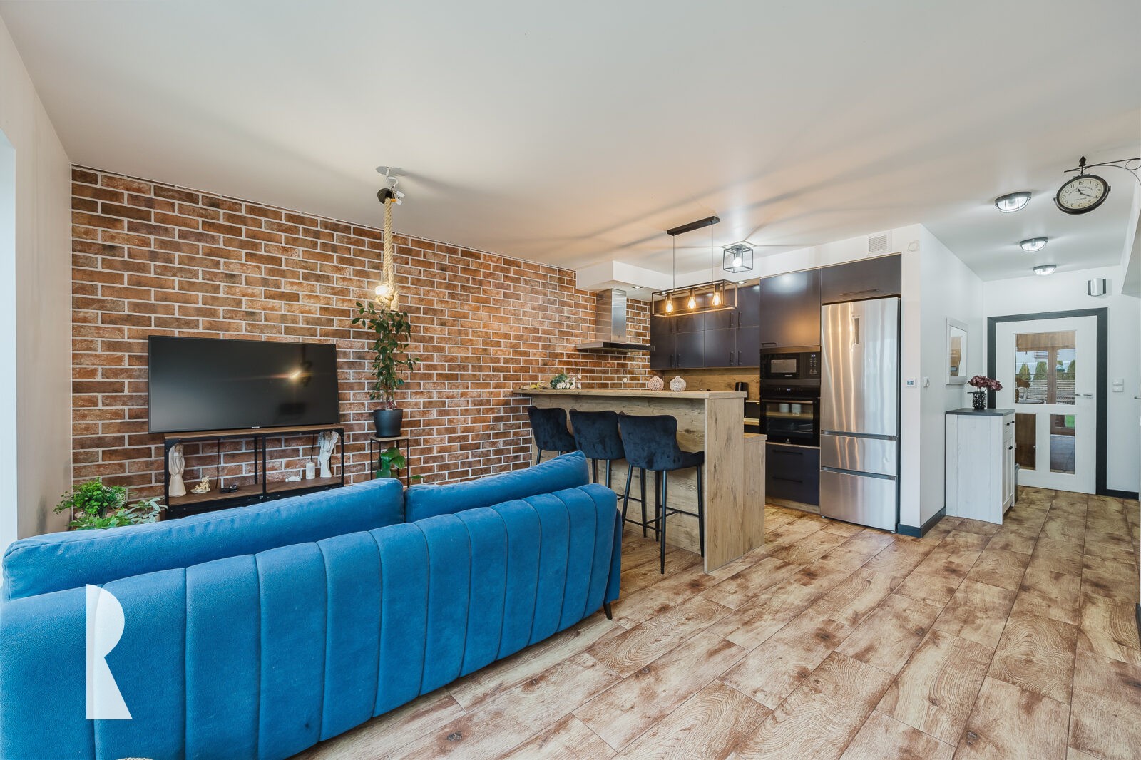 Nowoczesna kuchnia umeblowana jest na wymiar i wyposażona w markowy sprzęt AGD Samsung i Heier. Bar oddzielający kuchnię od salonu zapewnia miejsce do rozmów podczas domowych imprez, jak też służy domownikom do szybkich posiłków. Część jadalniana mieści stół na 6 osób. Miejsce do wieczornego i weekendowego relaksu zapewnia duża sofa i miejsce na sprzęt RTV. Dodatkowy kanał kominowy przewiduje możliwość instalacji kominka.