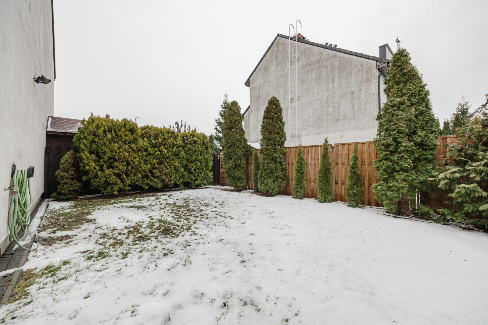 Ogród ok. 100 m² z tarasem z kostki granitowej (ok. 40 m²), trawnikiem oraz domkiem narzędziowym.