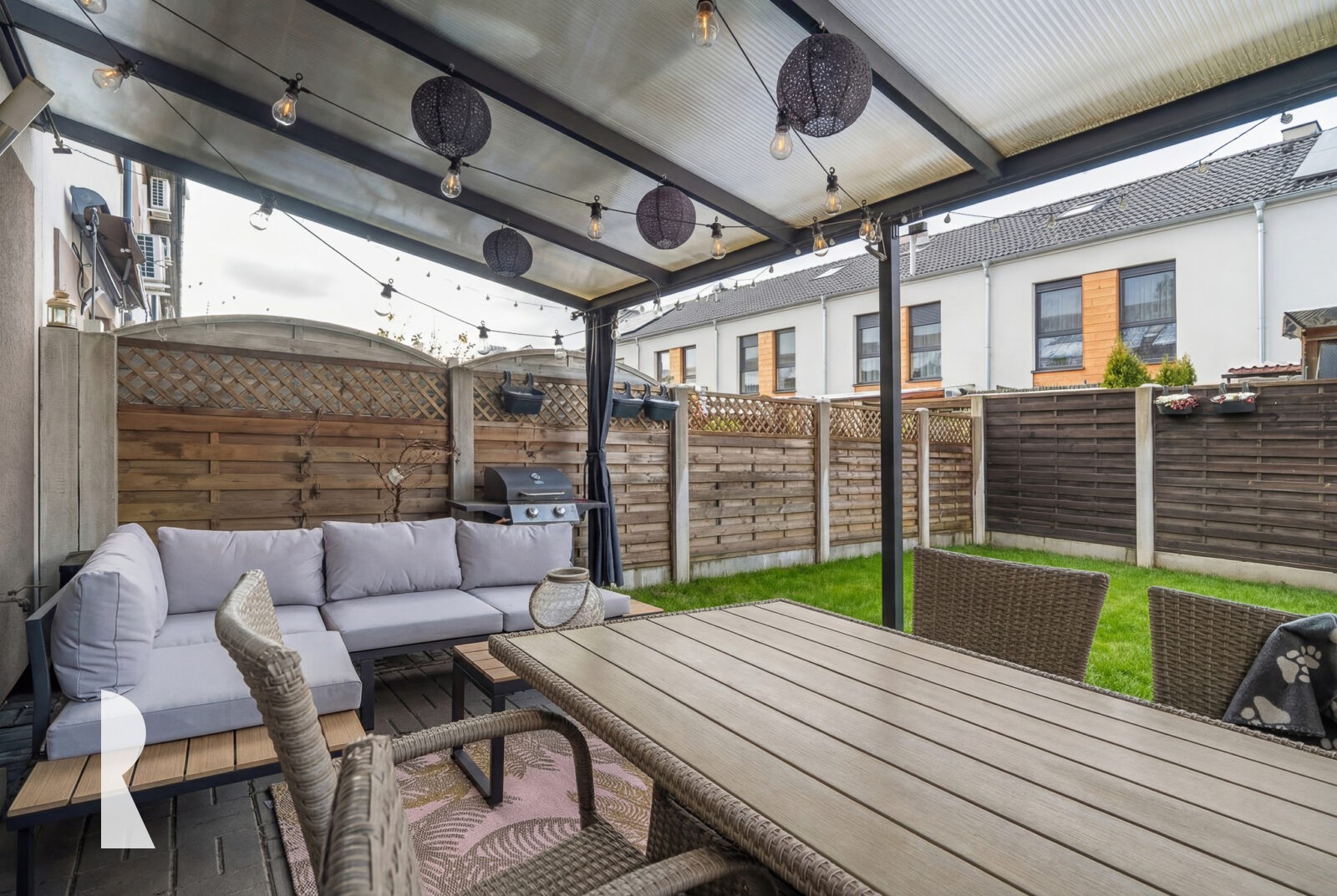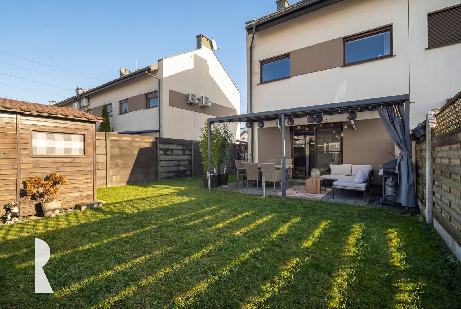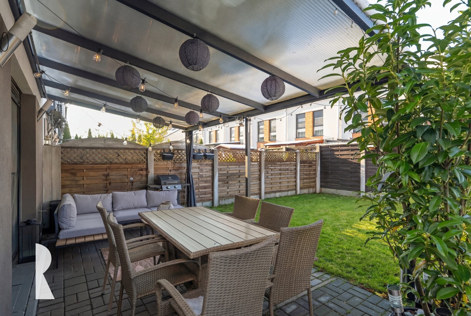 Do nieruchomości przynależy zadbany ogród z tarasem, wyposażonym w zadaszoną aluminiową pergolę z możliwością rozbudowy, oraz domek narzędziowy.