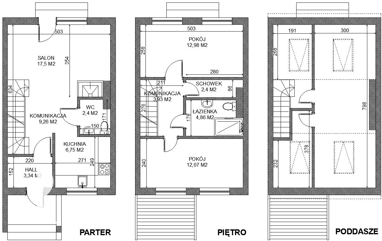 Dom składa się z trzech poziomów o łącznej powierzchni użytkowej 76,41 m², a łączna powierzchnia wraz z sypialnią na poddaszu wynosi 112 m².