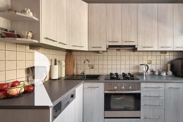 Na podłogach panele i płytki.
