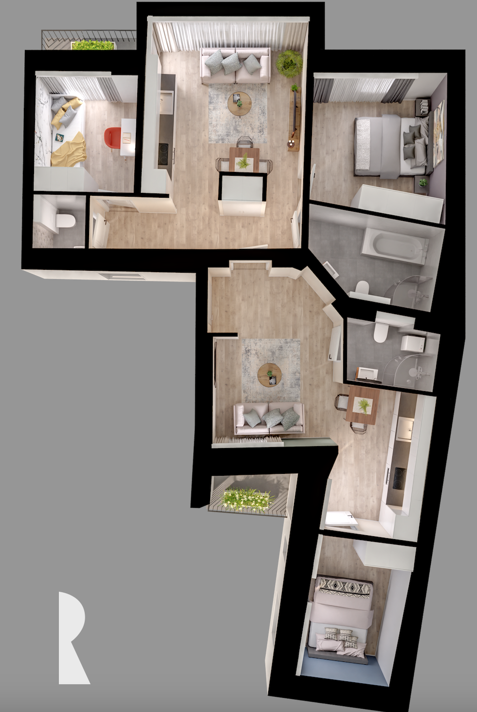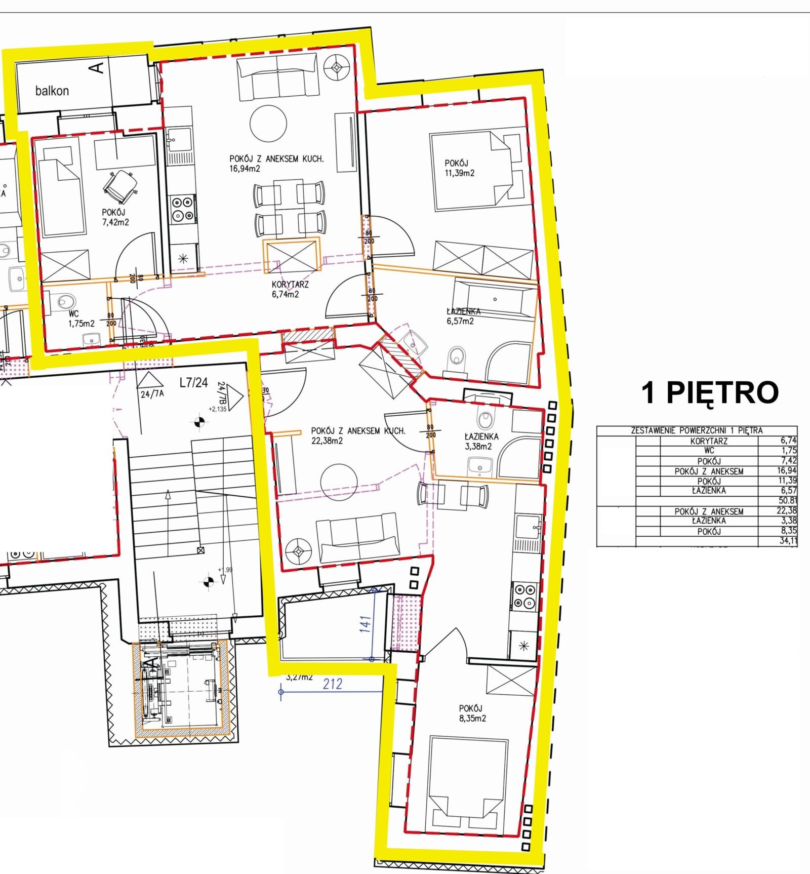 Mieszkanie o powierzchni 84,27 m² składa się z czterech ustawnych pokoi i posiada dwa balkony. Aktualnie rozpoczęto już prace umożliwiające podział lokalu na dwa niezależne mieszkania – wykonano dwa osobne wejścia oraz rozdzielono media, co daje szerokie możliwości adaptacji przestrzeni. Jest możliwość wydzielenia mieszkania 3-pokojowego oraz obok 2-pokojowego.